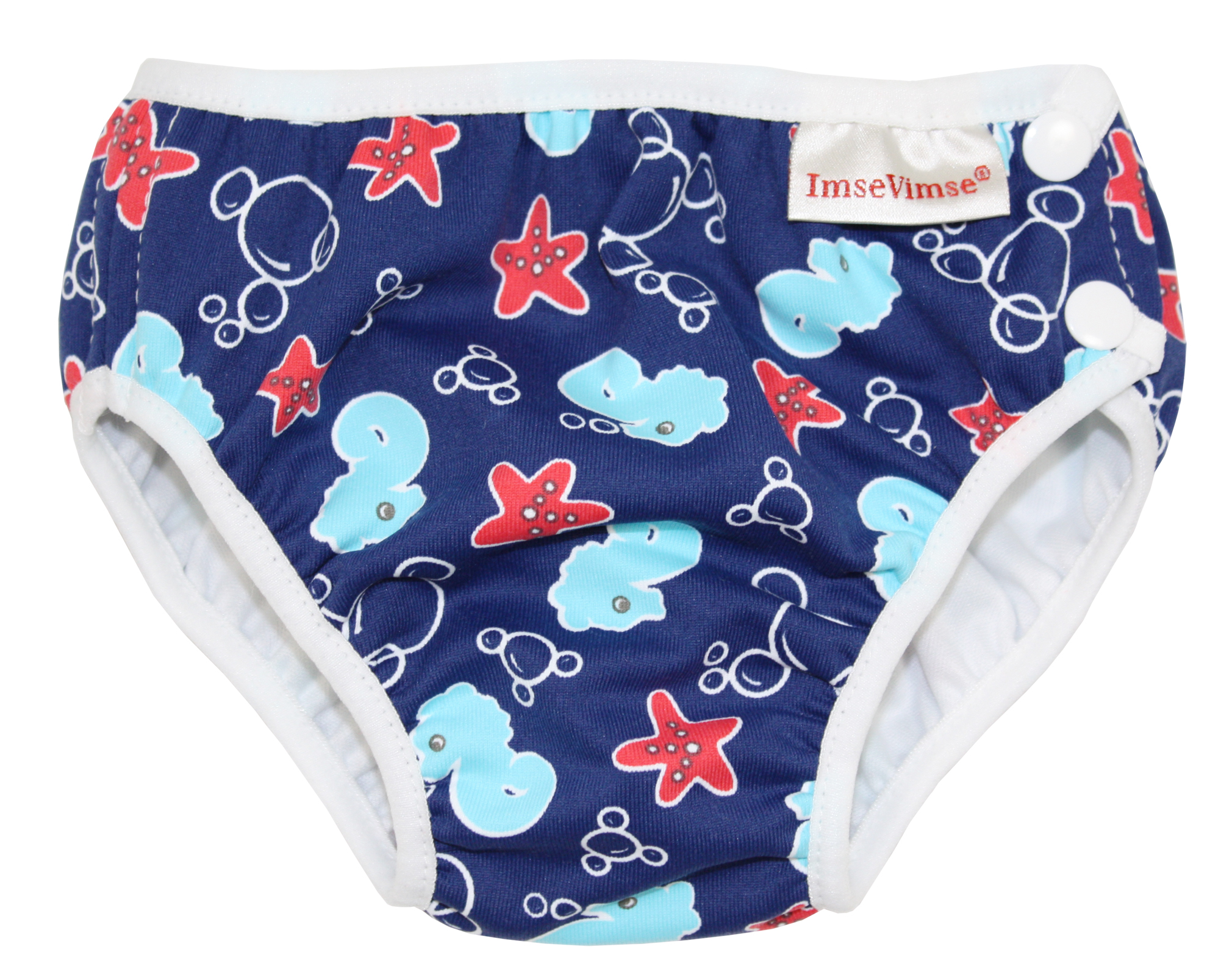 Plavky pro nejmenší děti s prodyšnou, nepromokavou podšívkou. Měkké pružné lemy kolem nožiček a v pase. Zapínání na patentky pro snadnější oblékání a svlékání mokrých plavek. Uvnitř příjemný polyester. Vhodné pro kojenecké plavání, do bazénu i na pláž. Plenkové plavky Imse Vimse výborně sedí, nebrání děťátku ve volném pohybu ve vodě a účinně chrání vodu před znečištěním. Měkké a velmi pružné lemy kolem nožiček a v pase velmi spolehlivě těsní.
